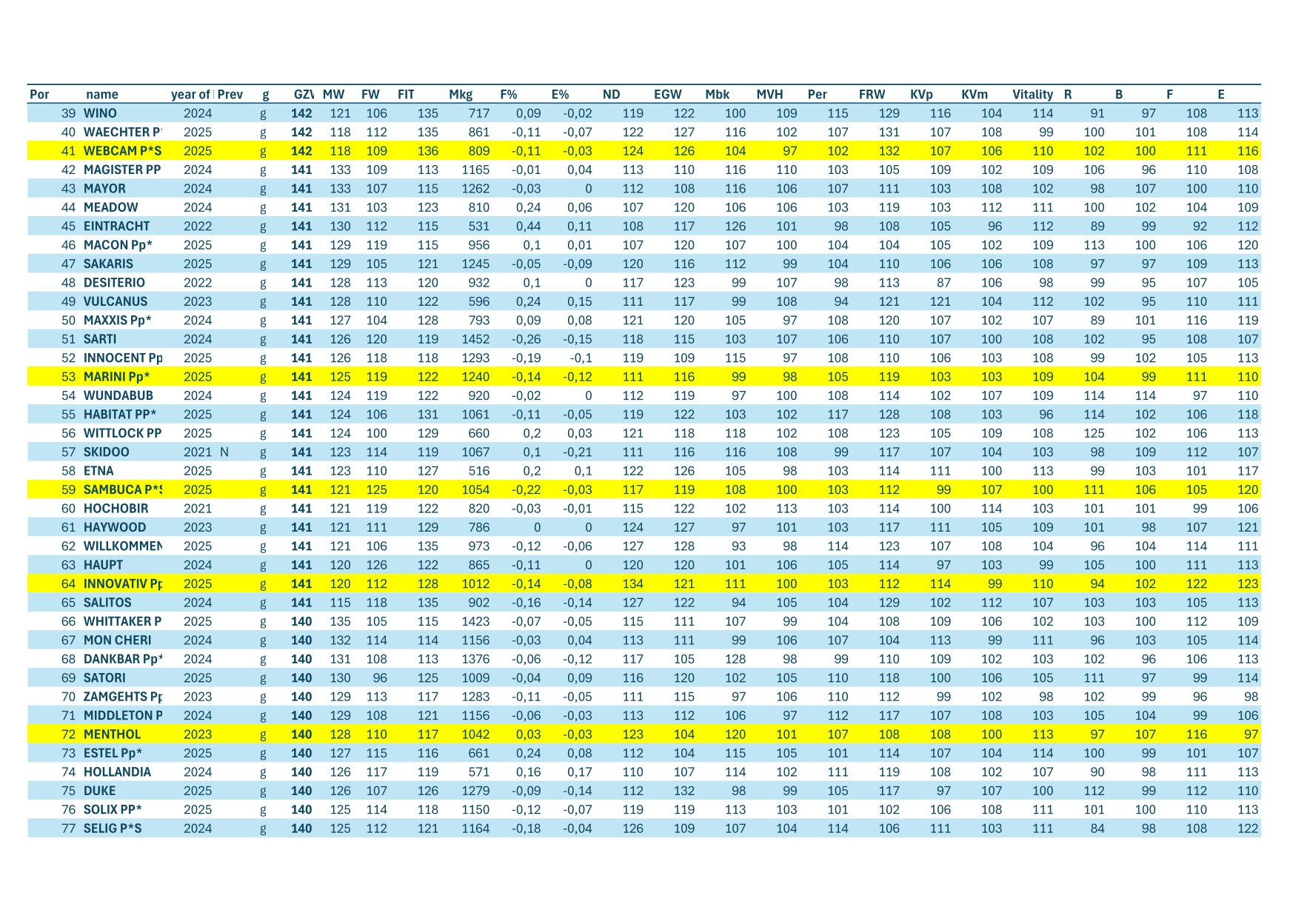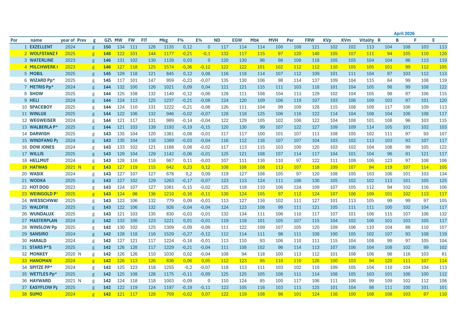 Je potešujúce, že naša spoločnosť Bayern Genetik má v tomto rebríčku početné zastúpenie býkov. Na druhej a 4 priečke sa umiestnili býci WOLFSTANZ a MILCHWERK ( u nás registrovaný pod št. registrom MHG-009)