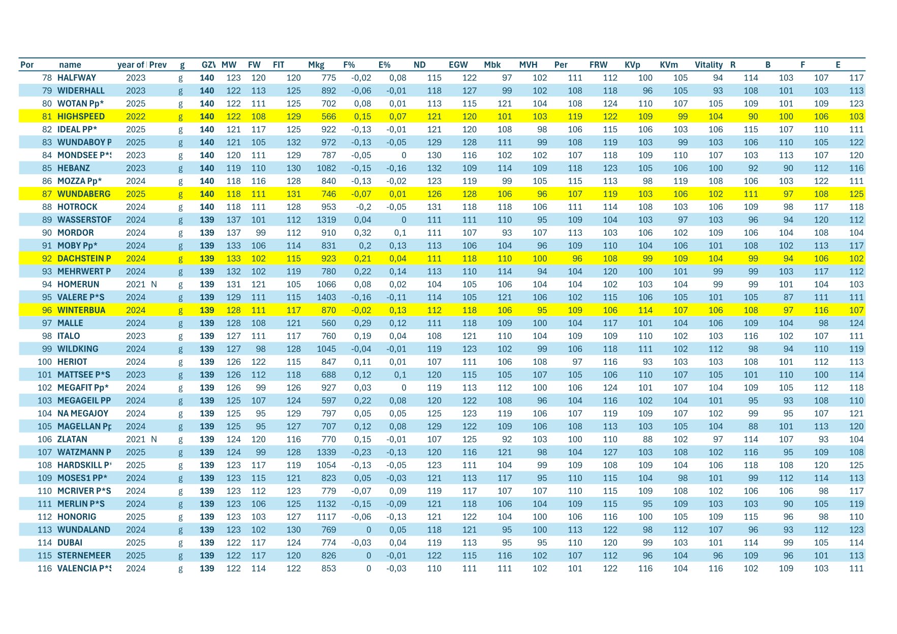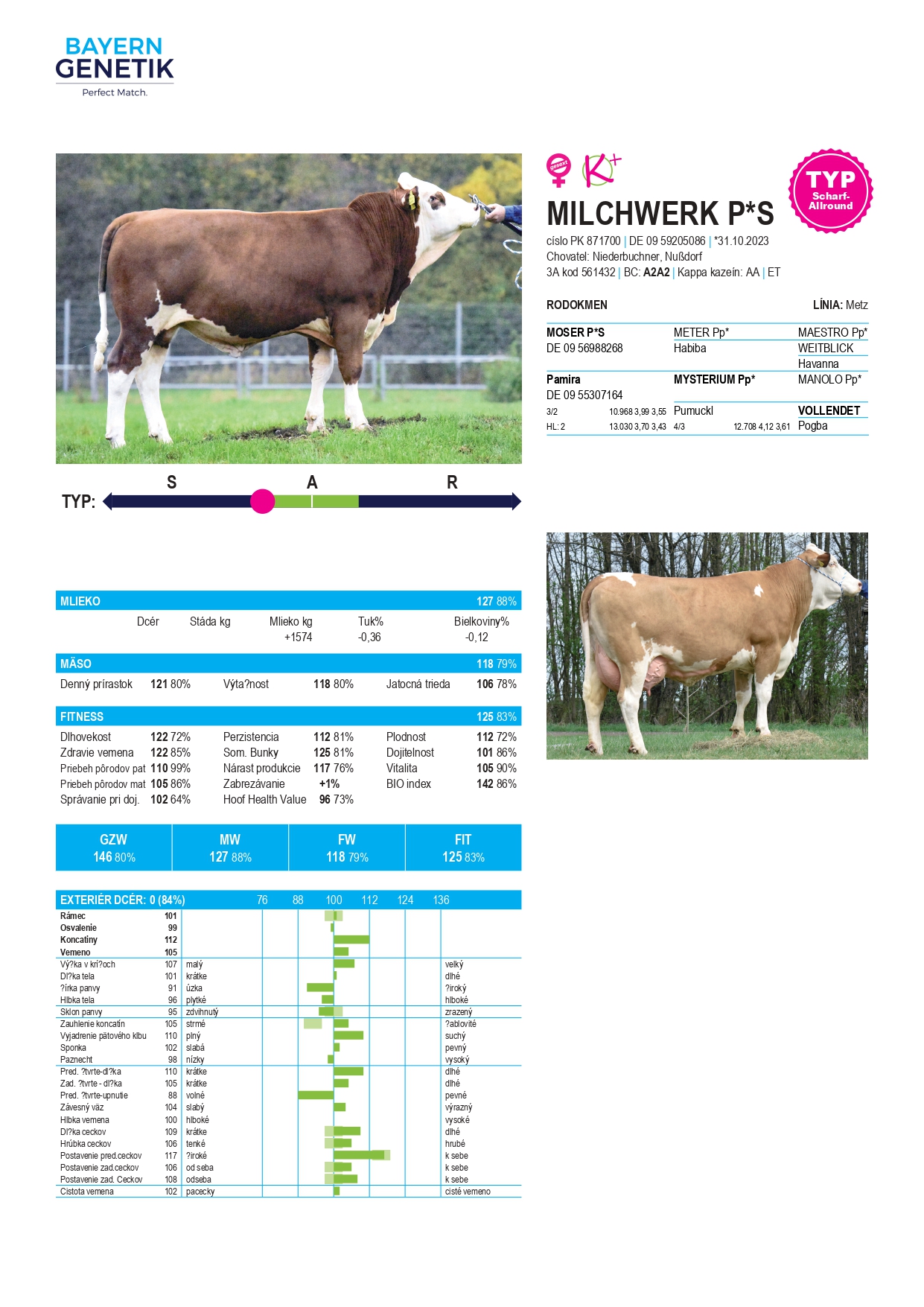 Osobitne nás teší umiestnenie býka MILCHWERK P*S, ktorý si drží vysokú hodnotu pre Mlieko +1574 kg, Fynikajúce Znaky zdravia ( Fitness 125) a veľmi priaznivé znaky vemena s dôrazom na postavenie, rozmiestnenie, dĺžku a hrúbku ceckov, parametre nesmierne dôležité pre strojové a automatické dojenie.